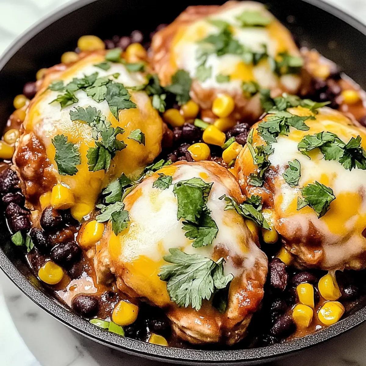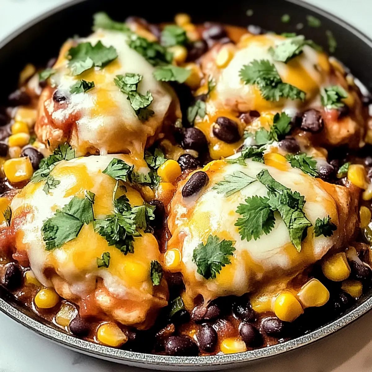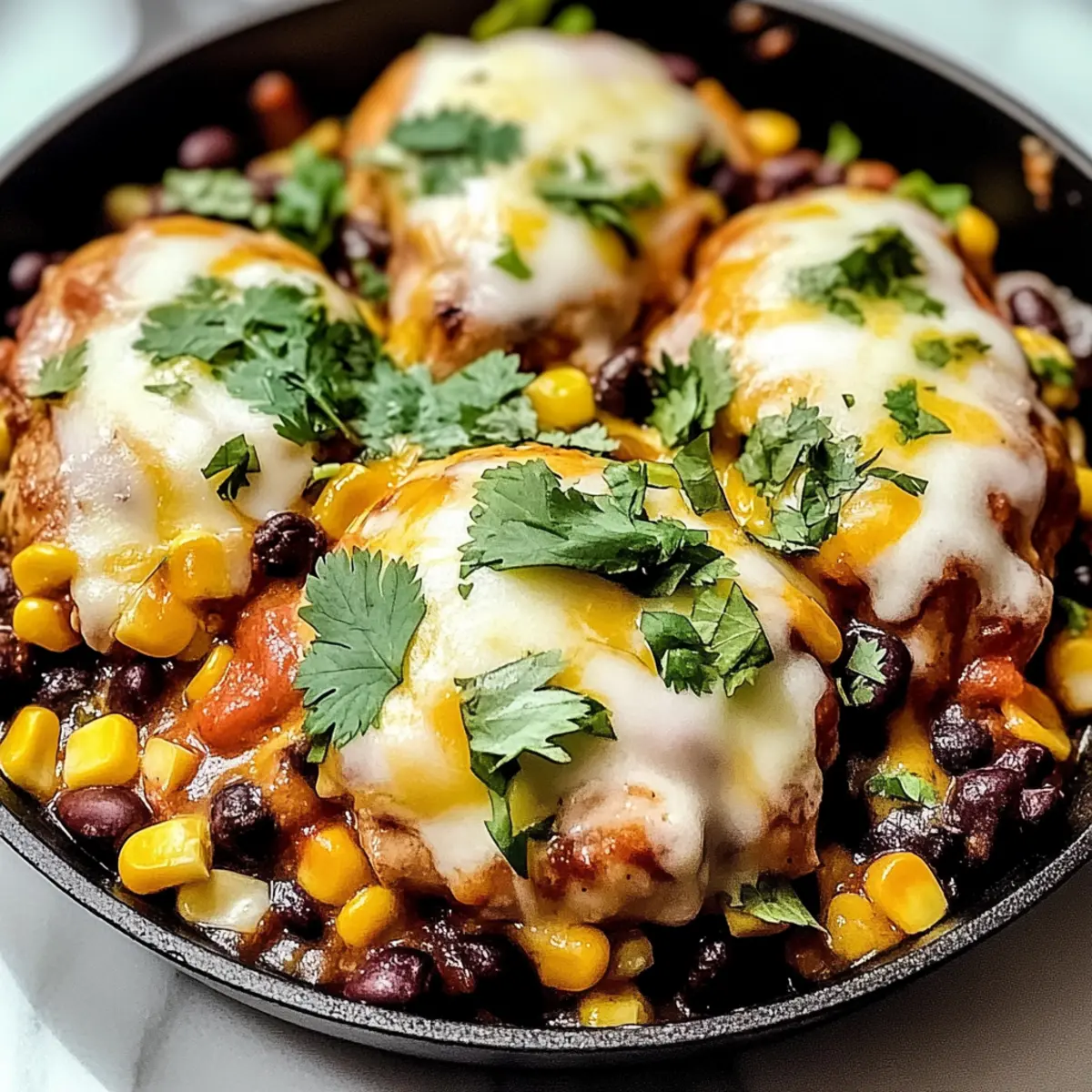 Once baked, remove the skillet from the oven and let it cool for a minute. Garnish the dish with fresh cilantro for a pop of color and added flavor. Serve the Santa Fe Chicken Skillet directly from the skillet for a warm, hearty meal that’s both vibrant and satisfying, perfect for any hungry family.