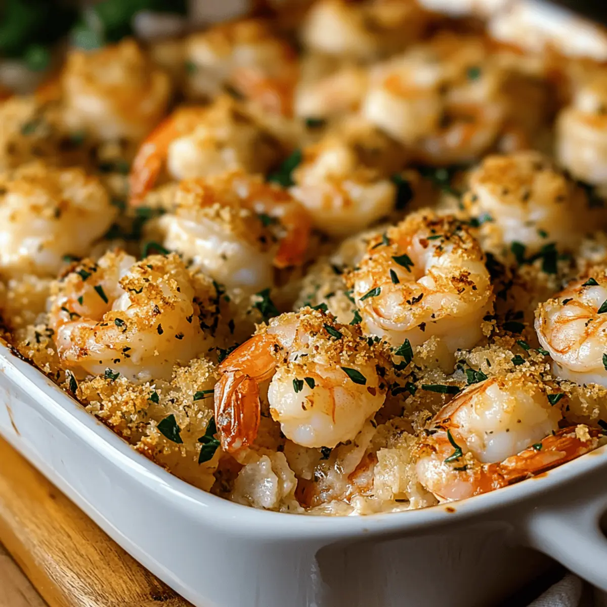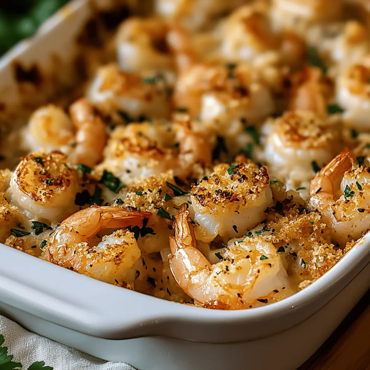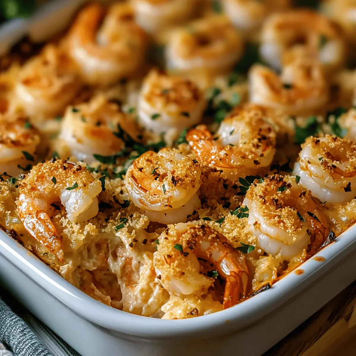 Carefully transfer the baking dish to the preheated oven and bake for 20-25 minutes. You’ll know it’s ready when the shrimp turn opaque and the topping is golden brown, giving it that irresistible crunchy finish. The rich aroma will fill your kitchen, making it hard to wait!