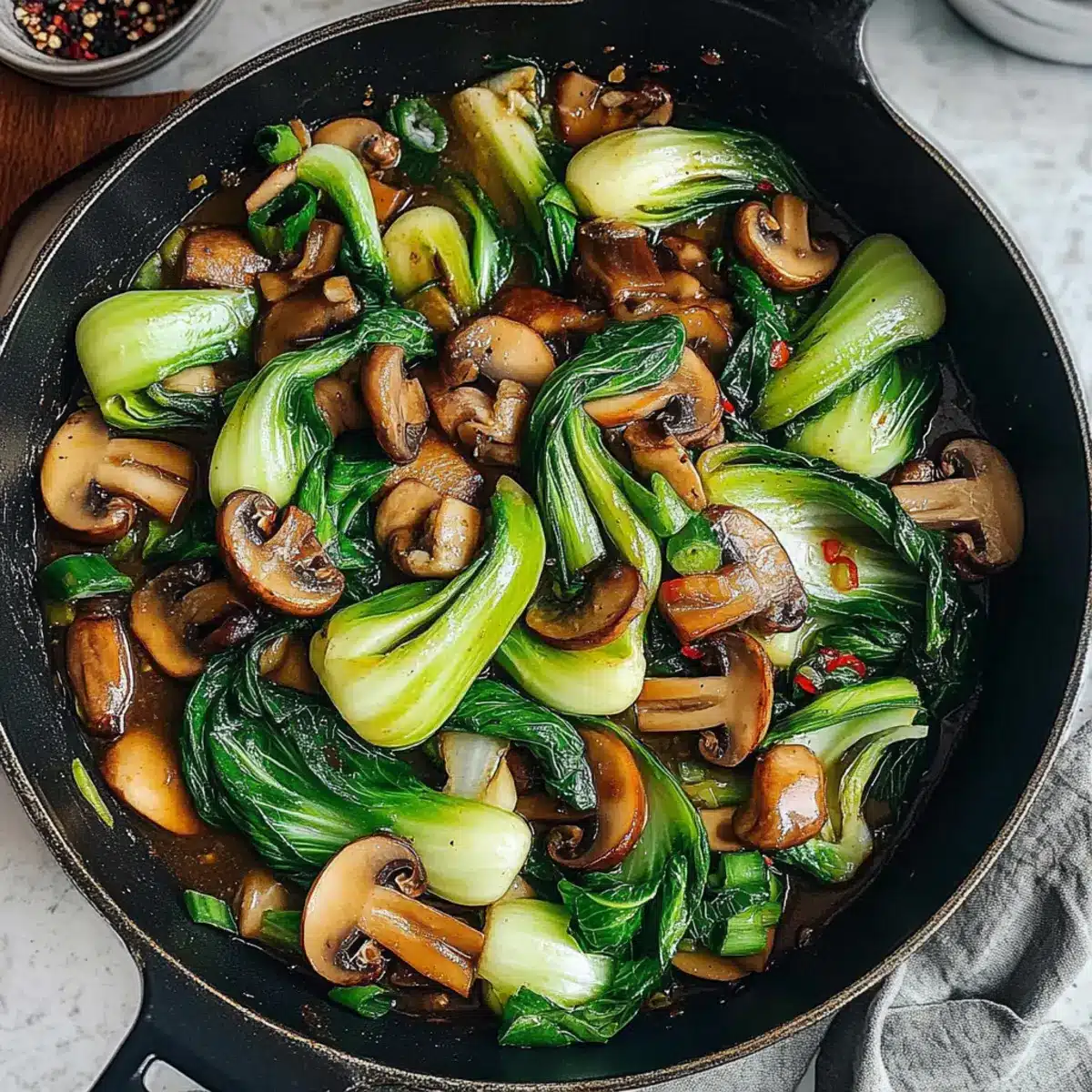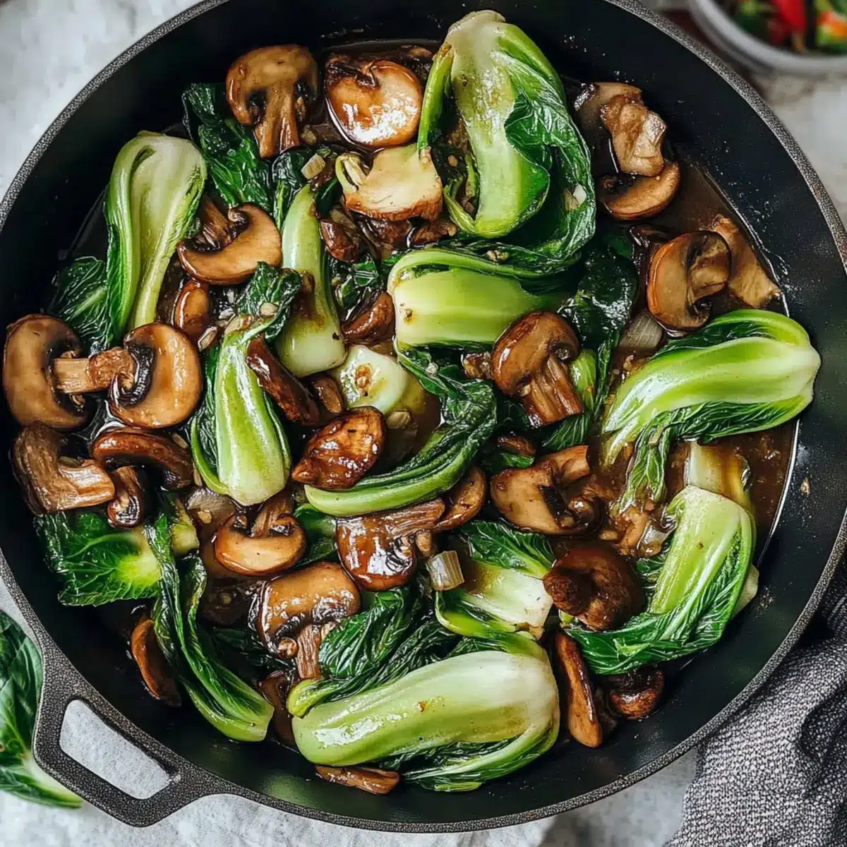 Return the steamed bok choy back into the skillet with the mushrooms and aromatics. Pour in the sauce you prepared earlier, tossing everything gently to ensure the vegetables are well coated in that rich, garlicky brown sauce. Allow the mixture to cook together for another 30 seconds so all the flavors meld beautifully.