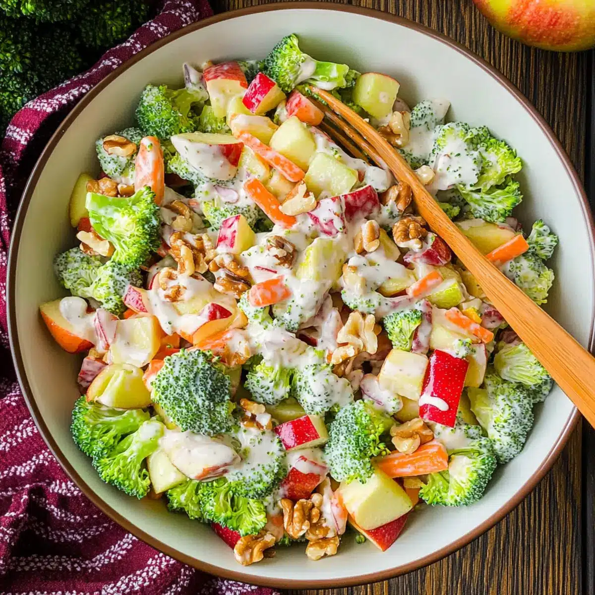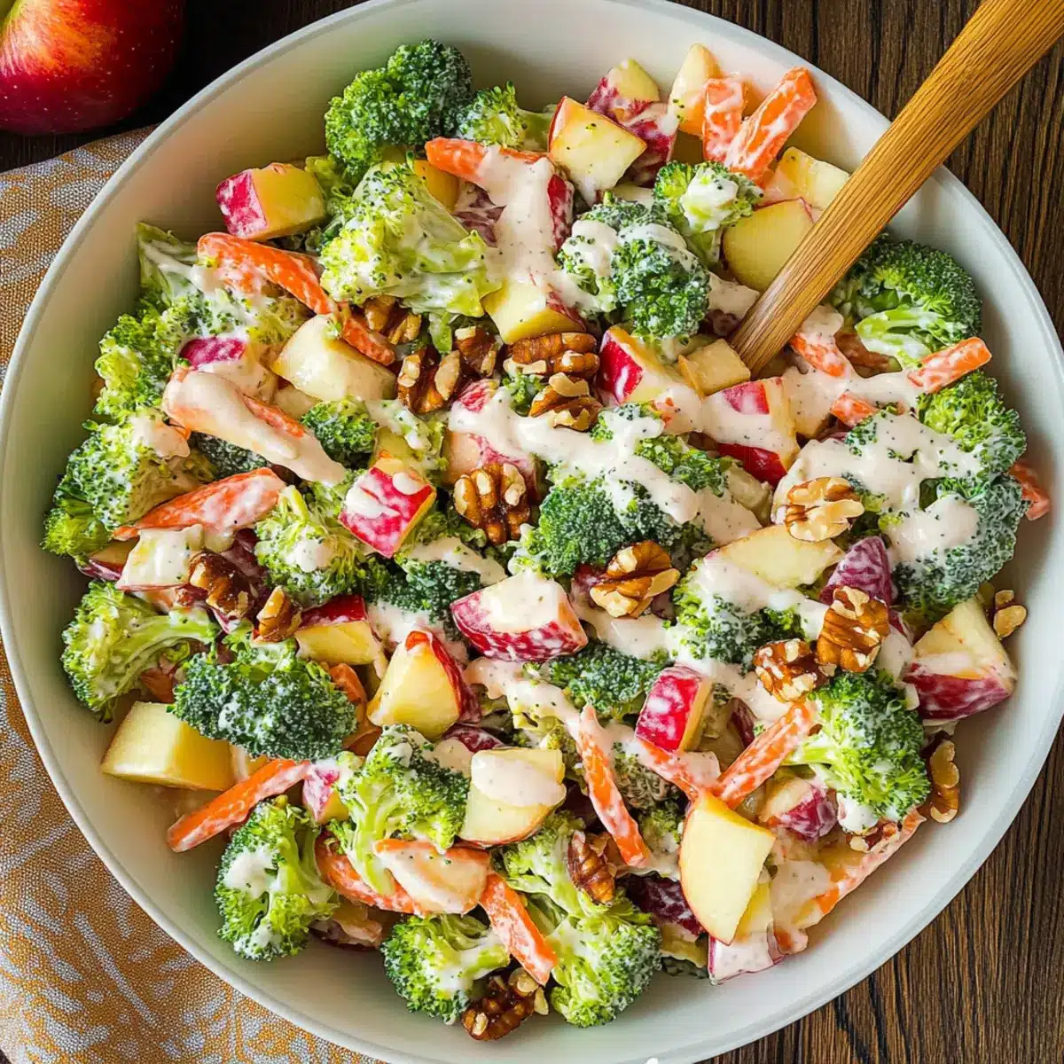 Freshness bursts from every bite with crisp broccoli and juicy apples, making for a vibrant dish. Nutritious and guilt-free, this Broccoli Apple Salad is packed with vitamins and flavor. Quick to prepare, you’ll find it an easy addition to your meals, whether it’s for a picnic or a cozy dinner at home. Versatile enough to swap ingredients — try sunflower seeds instead of walnuts or add bacon bits for a twist! Each serving offers a delightful crunch and satisfying creaminess, perfect for anyone looking to stay healthy while enjoying delicious meals. Looking for more healthy salads? Check out my Coconut Pineapple Cheesecake or Pear Apple Grilled Cheese for ideas!