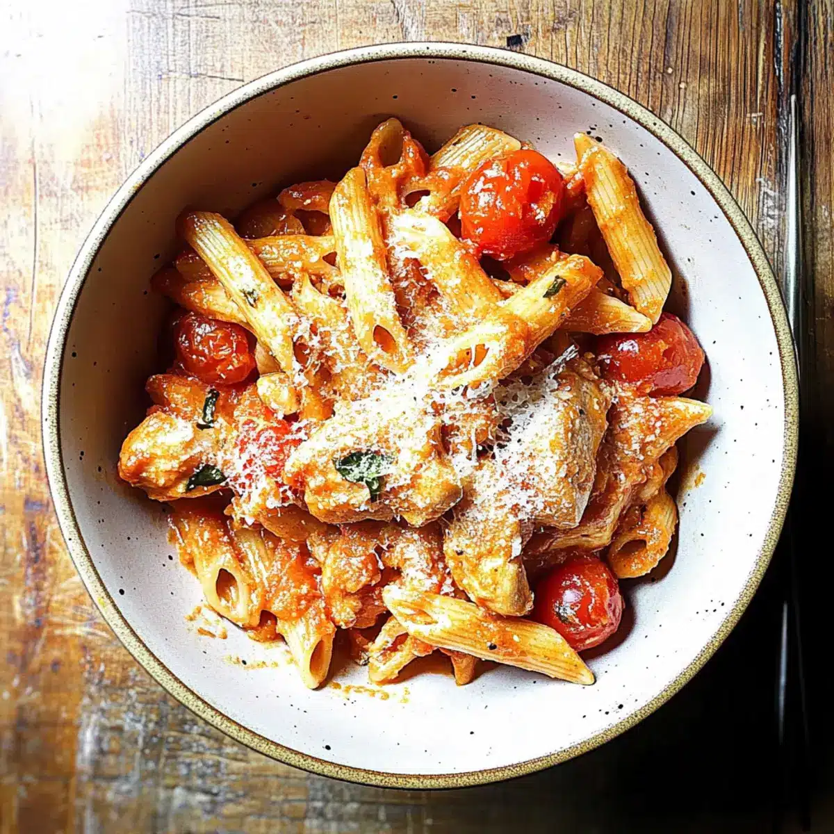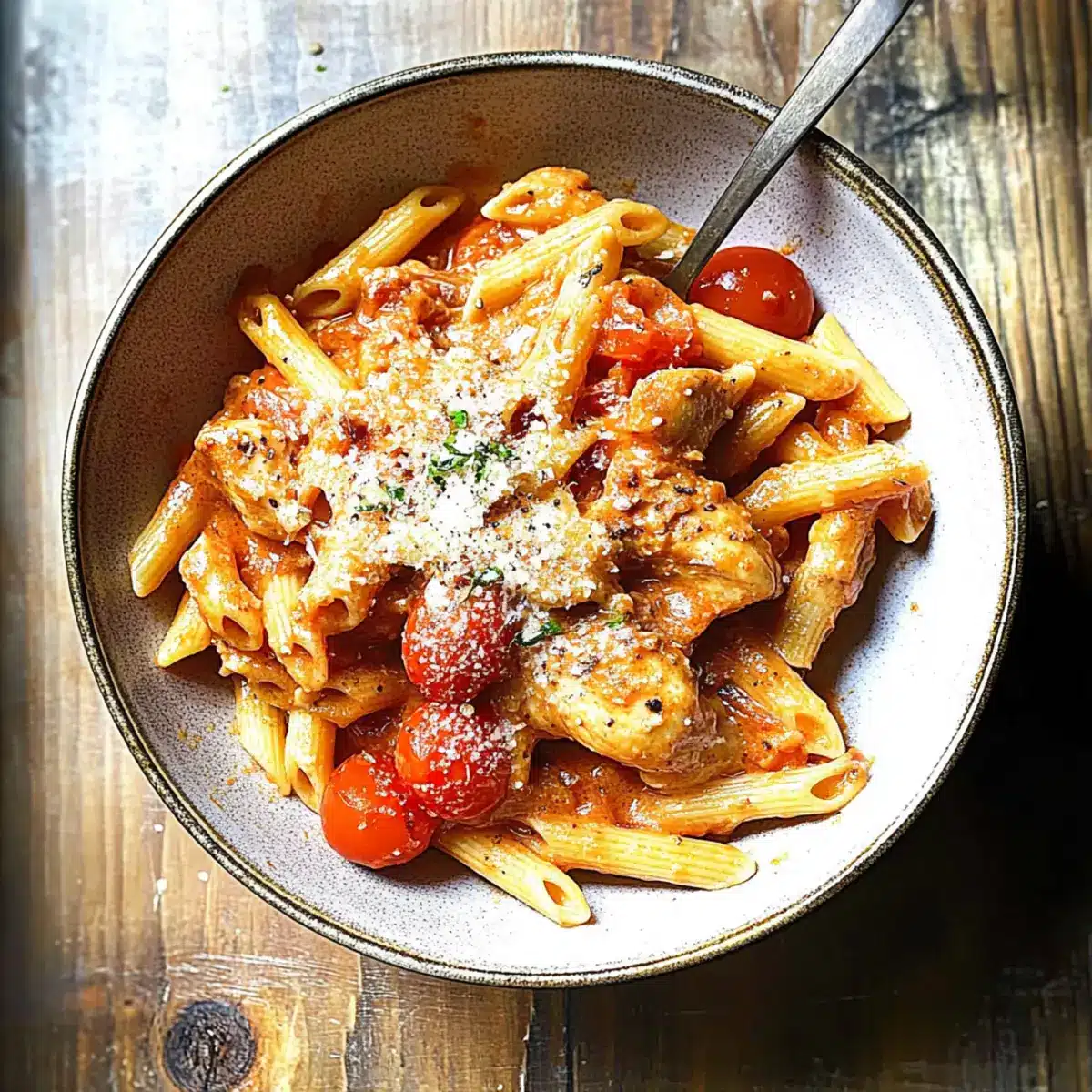 Add the cooked penne to the skillet, tossing it gently with the sauce until the pasta is well coated. If the sauce seems too thick, add reserved pasta water a little at a time until you reach your desired consistency—this step makes your Creamy Chicken all’Arrabbiata luxurious and enjoyable.