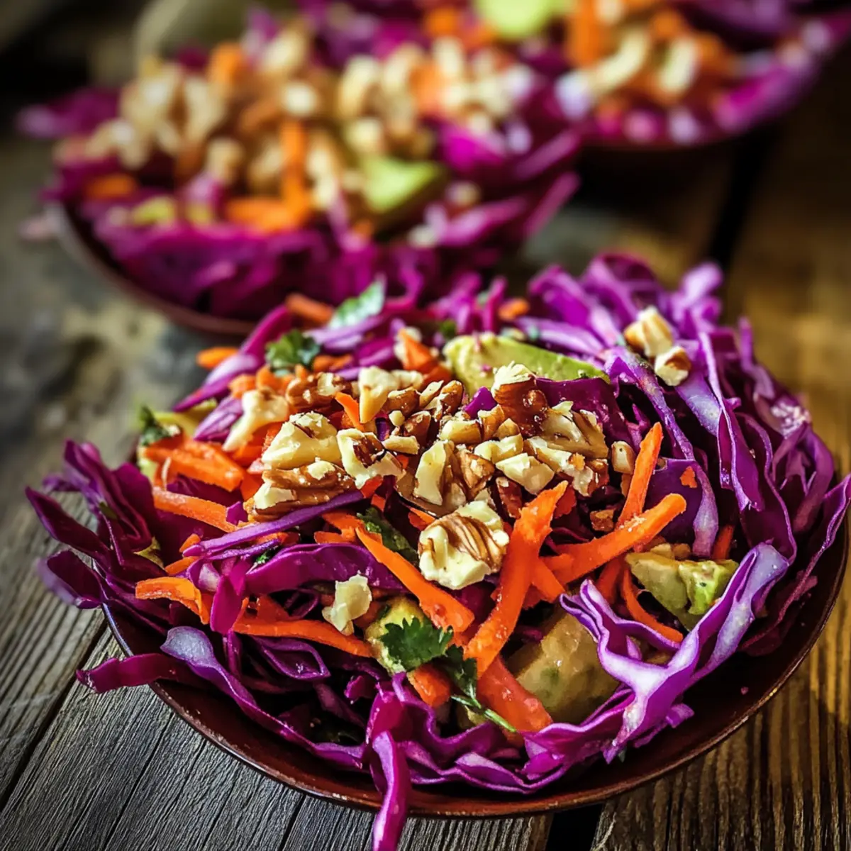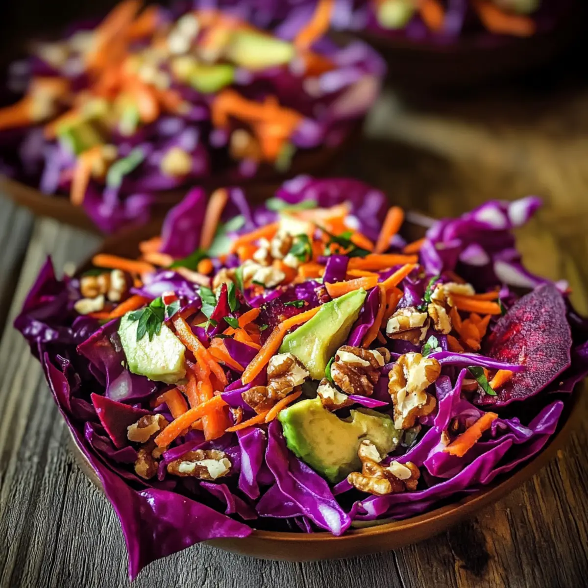 Vibrant, Fresh Ingredients: This salad bursts with colors from fresh vegetables like cabbage, carrots, and beets, creating a feast for the eyes and taste buds.