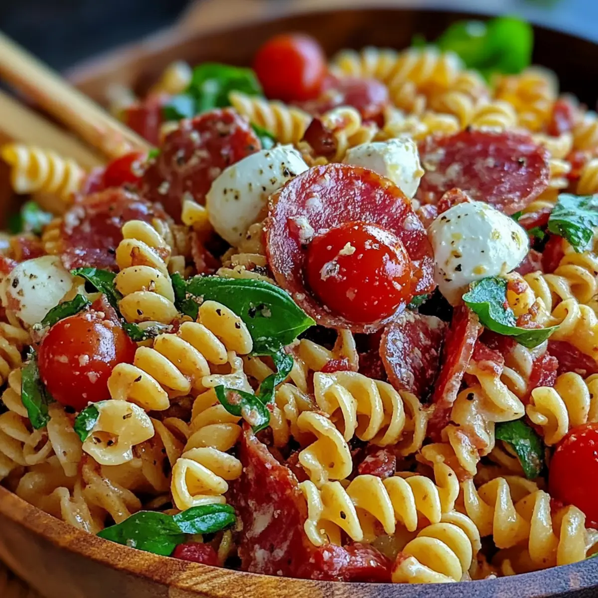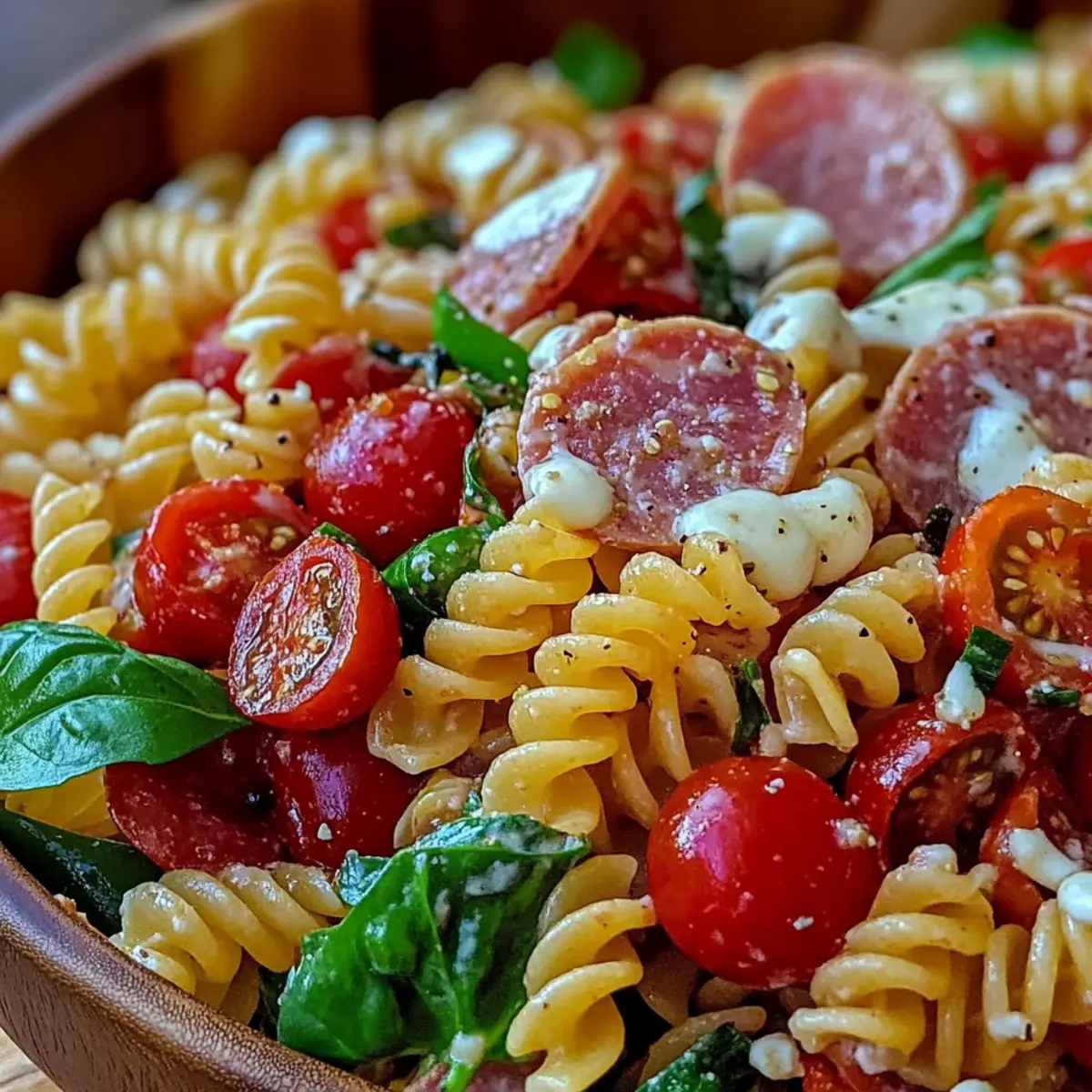 Caprese Skewers: Fresh basil, mozzarella, and tomatoes on skewers add a refreshing bite that contrasts perfectly with the savory pasta salad.