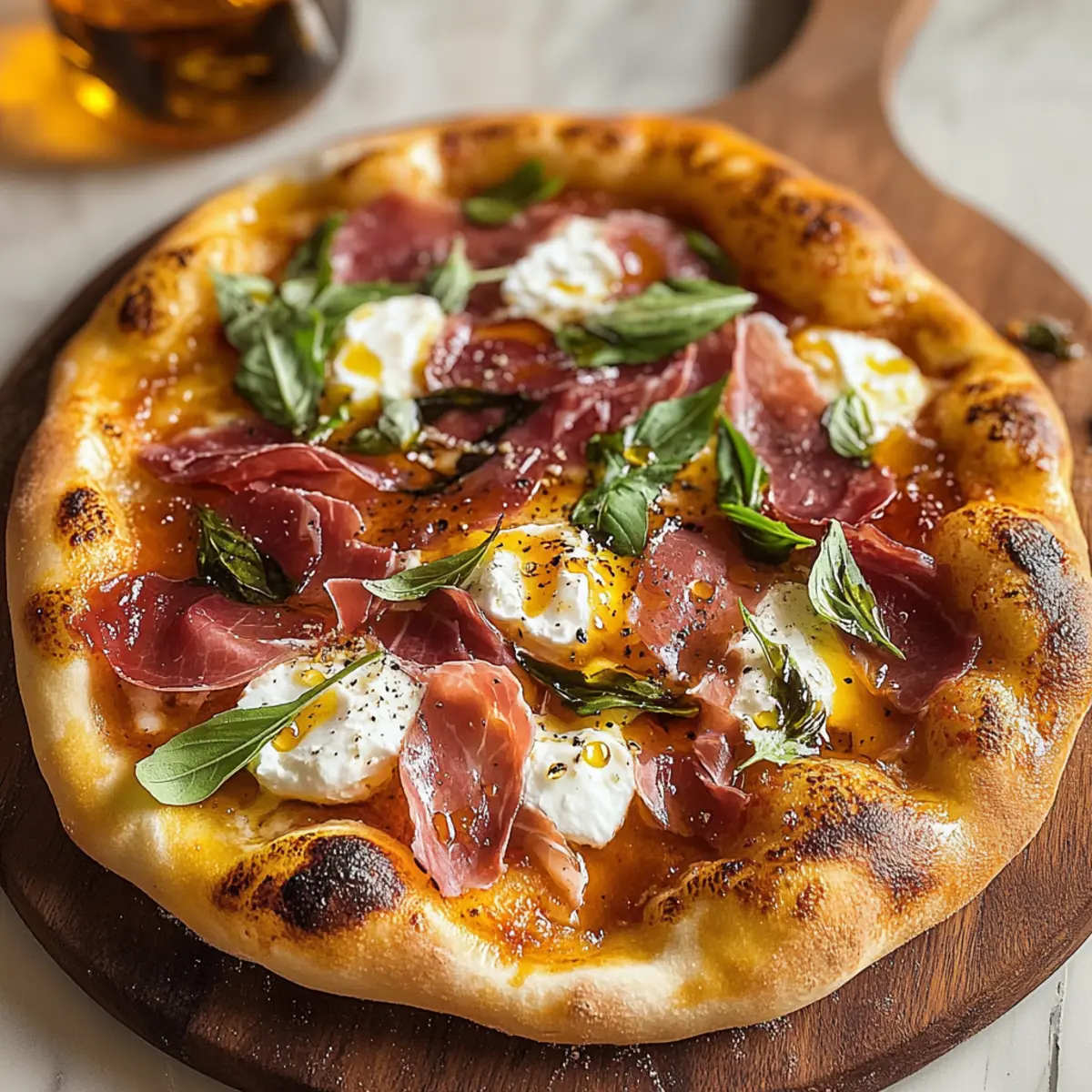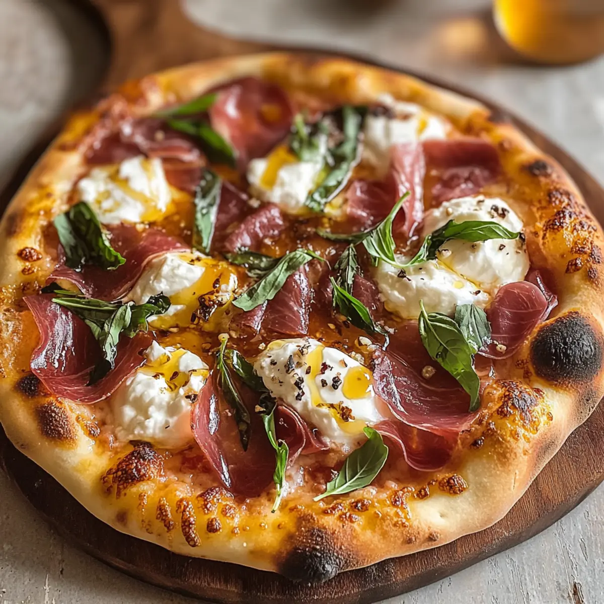 Generously drizzle honey over the entire pizza, allowing it to seep into the burrata and mingle with the prosciutto. This sweet touch is what makes the Honey Burrata Pizza irresistible, balancing the saltiness with a delicious sweetness.