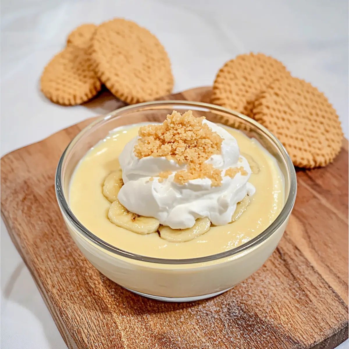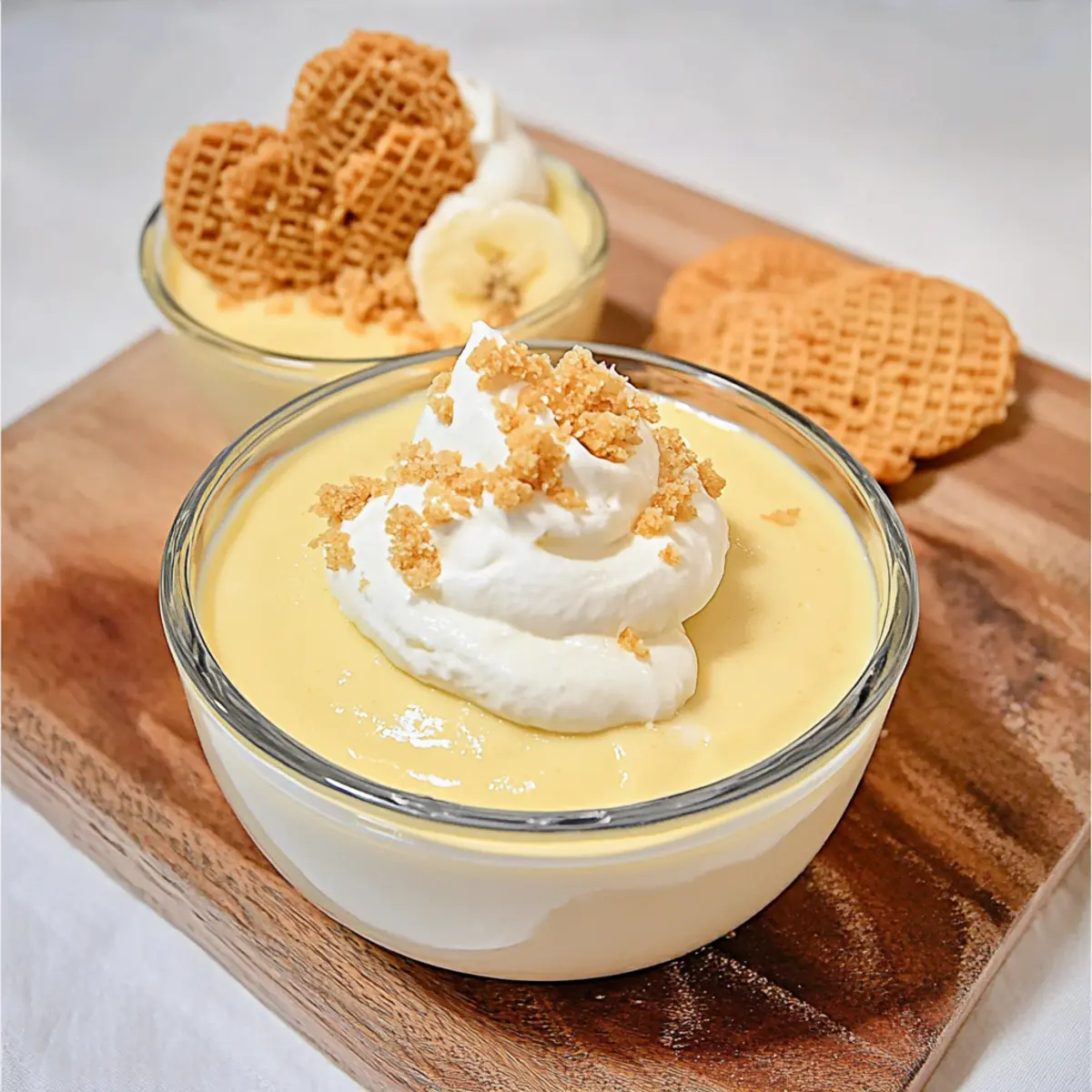 Once chilled, remove the pudding from the fridge. Spoon it into serving dishes and, if desired, top with whipped cream and crumbled High-Key vanilla wafer cookies for extra texture. The result is a beautiful presentation of keto banana pudding, ready to be enjoyed!