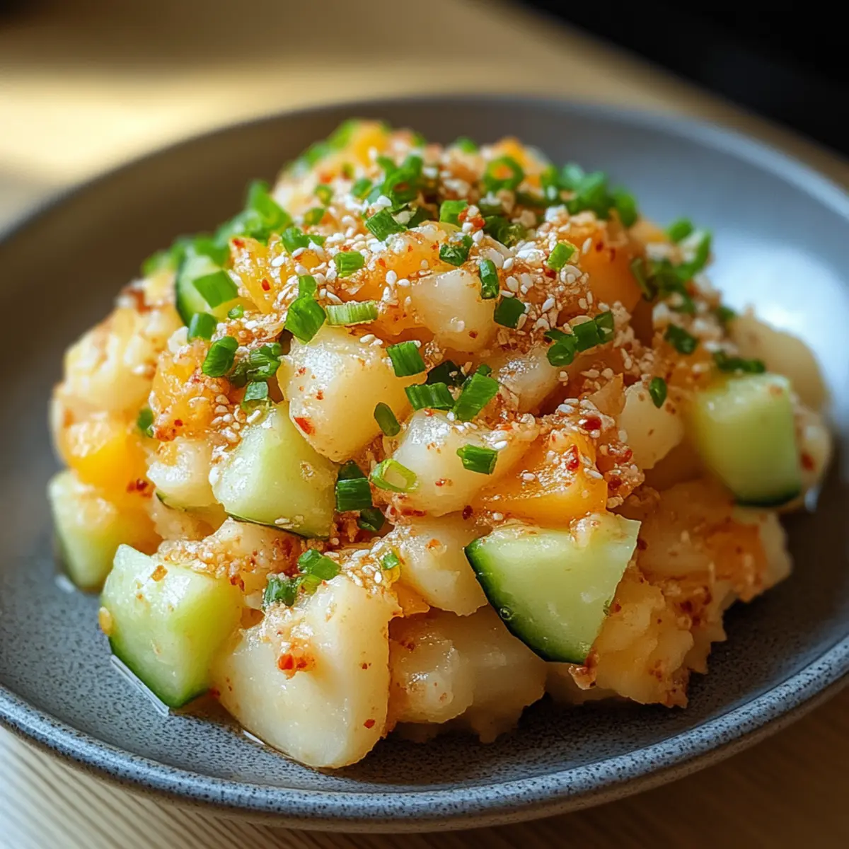 Tangy Cucumber Salad: Refreshingly crunchy and slightly tangy, this light salad enhances the overall dish while providing a palate-cleansing effect. The cucumber’s crispness beautifully complements the softness of the Korean Potato Salad.