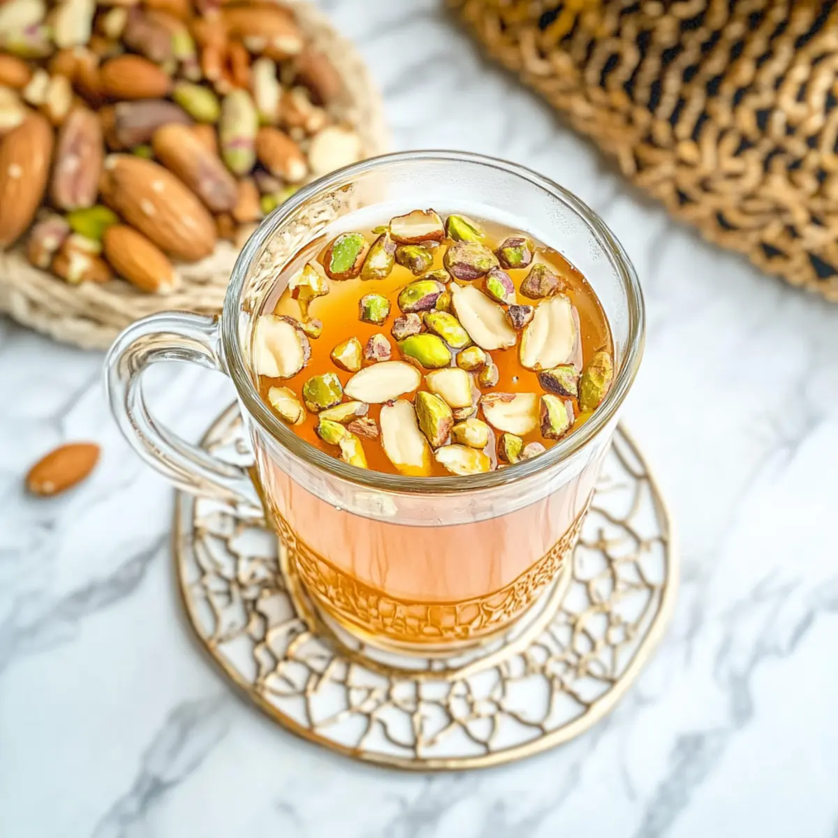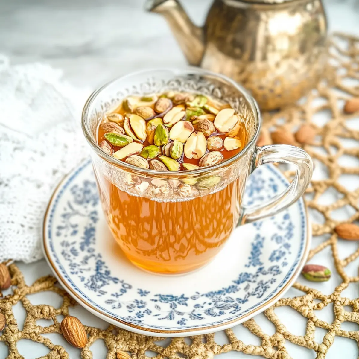 In each cup, distribute a lovely handful of chopped nuts such as walnuts, pistachios, or almonds. These toppings will add not only flavor but also a delightful texture to your Lebanese spiced tea, making each sip a unique experience to savor.