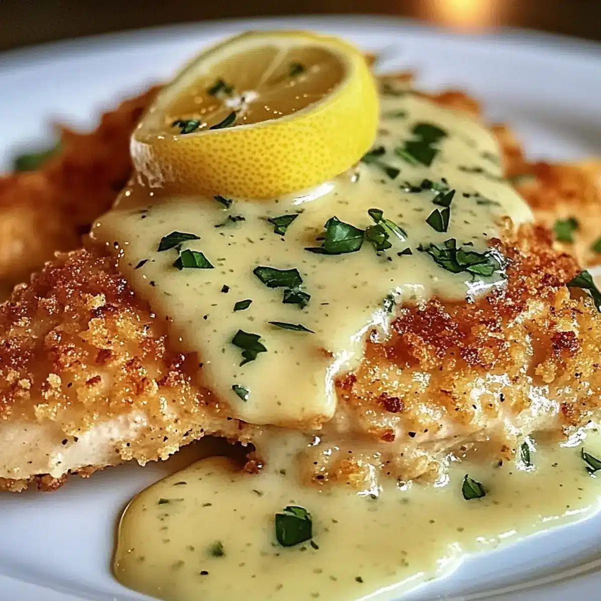 - Serve the chicken topped with creamy lemon sauce and garnish with parsley.