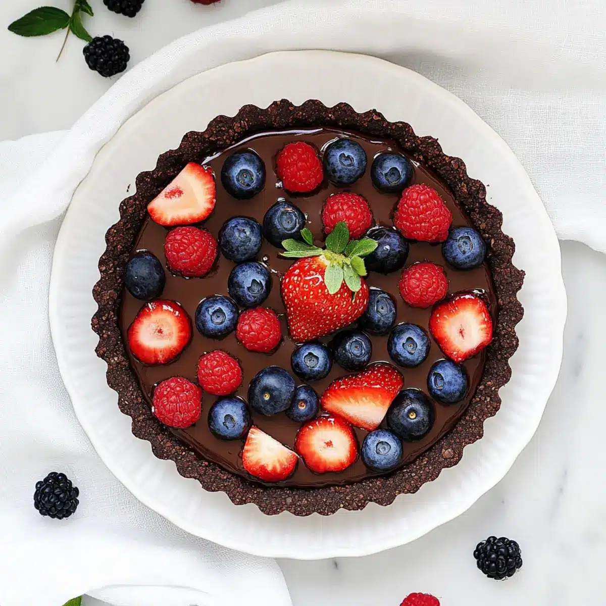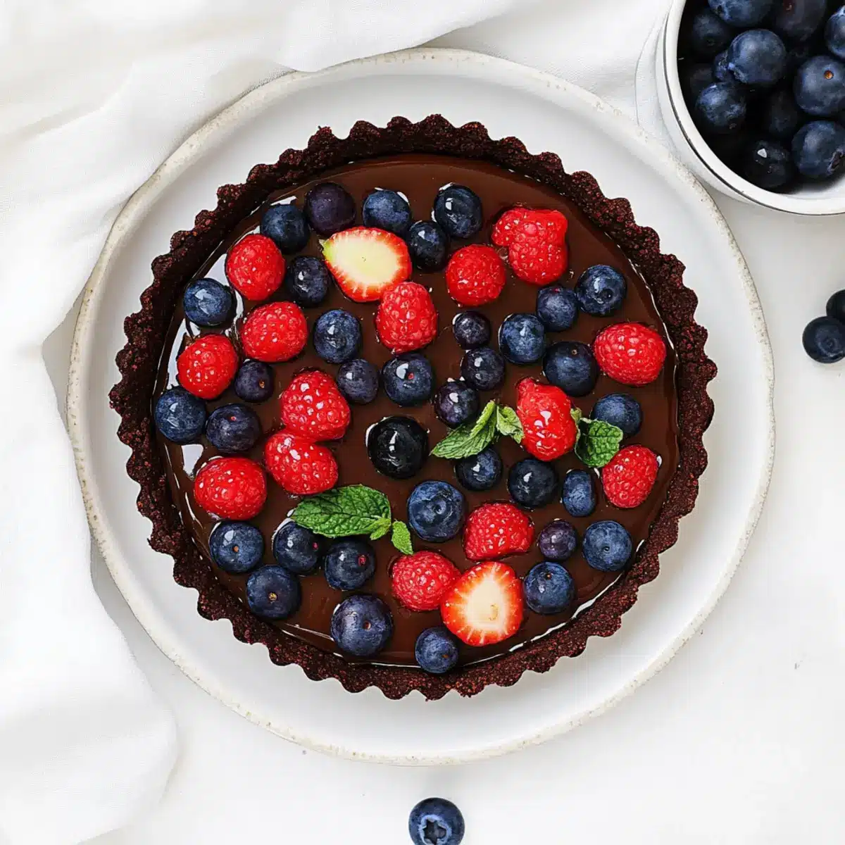 I often recommend strawberries and blueberries for the tart because they provide a delightful freshness and color contrast against the rich chocolate. Ensure you use fresh berries right before serving to maintain their vibrant appearance and juicy texture, avoiding frozen berries which can make the tart soggy.