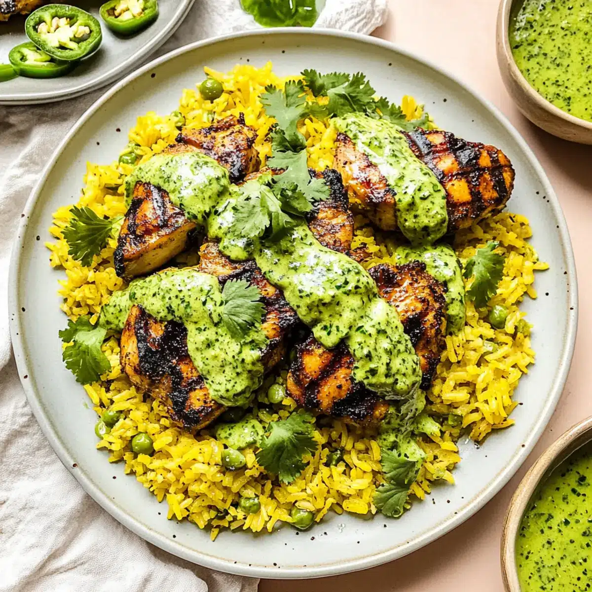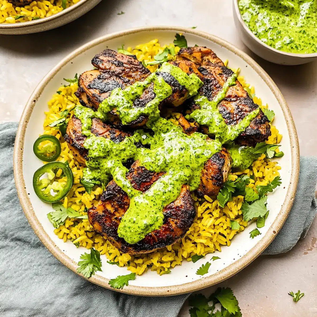 Once the chicken is done cooking and rested, fluff the rice and fold in the frozen peas for added color and nutrition. To serve, plate a generous portion of jasmine rice, top with a succulent piece of grilled chicken, and generously drizzle with the zesty green sauce. This vibrant presentation is bound to impress your family at dinner!