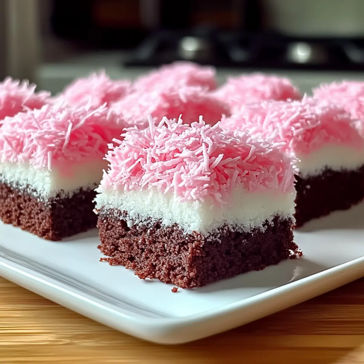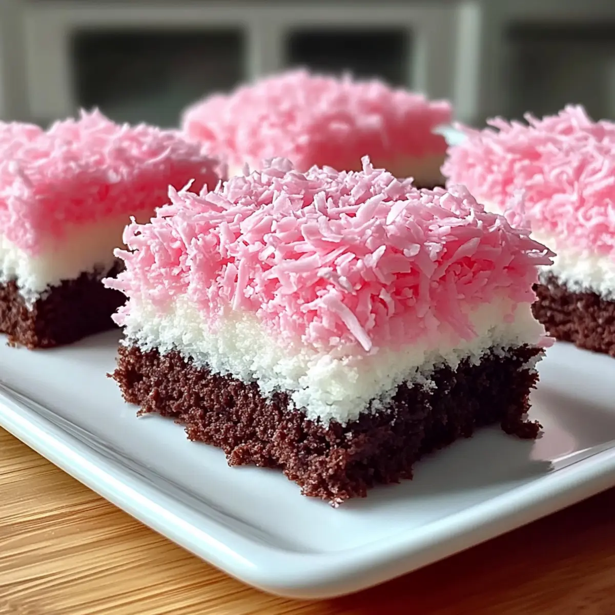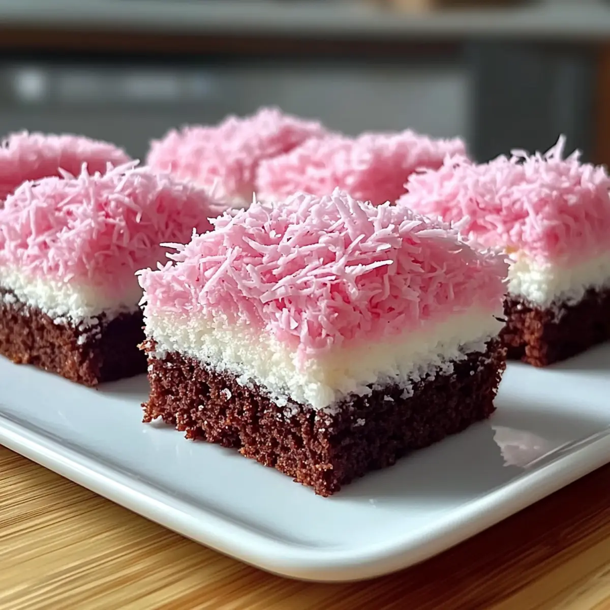 Decadent chocolate base pairs beautifully with a fluffy pink coconut topping—better than any bakery dessert.