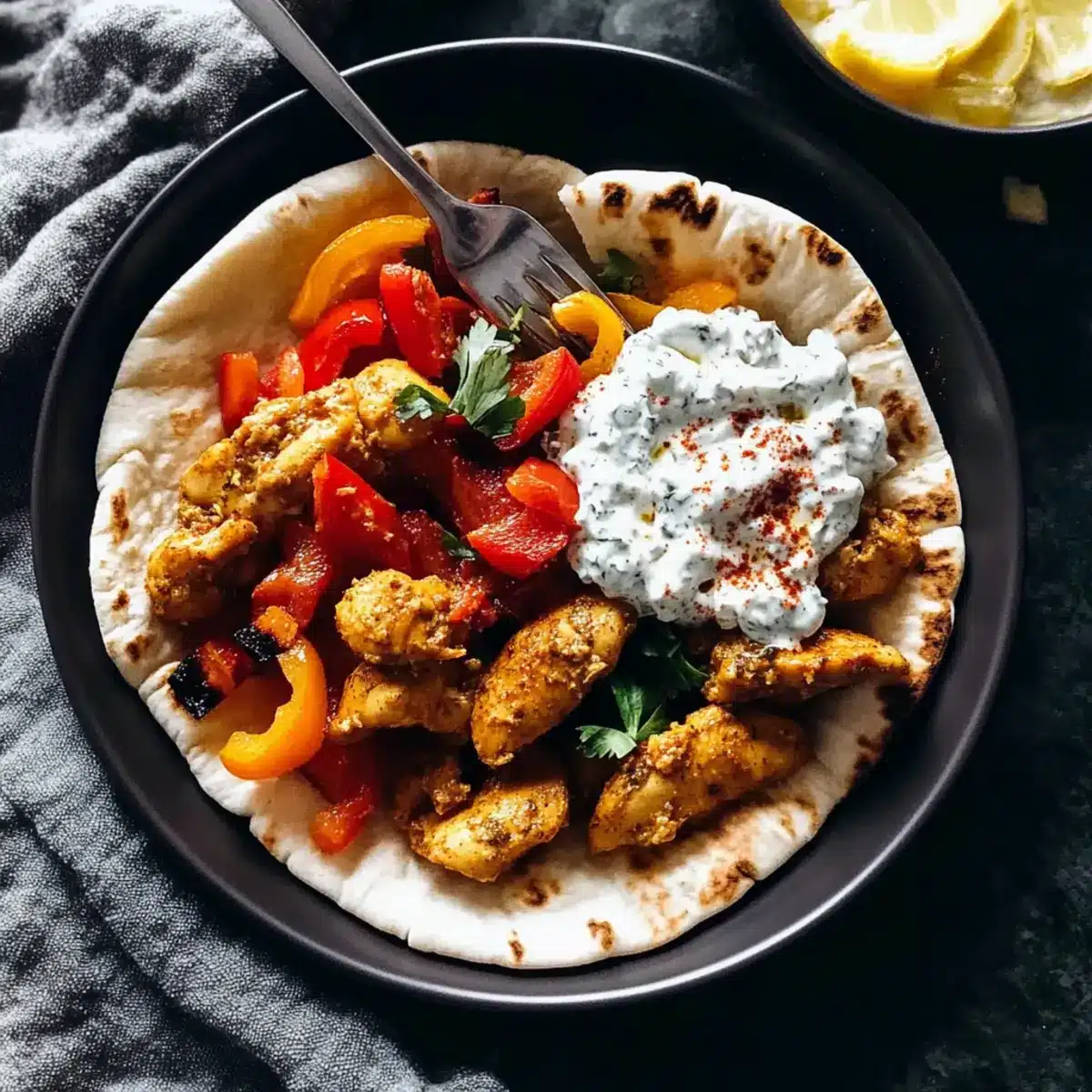 - Warm the pita bread and fill each with the roasted chicken, peppers, and tzatziki sauce, garnishing with fresh vegetables.