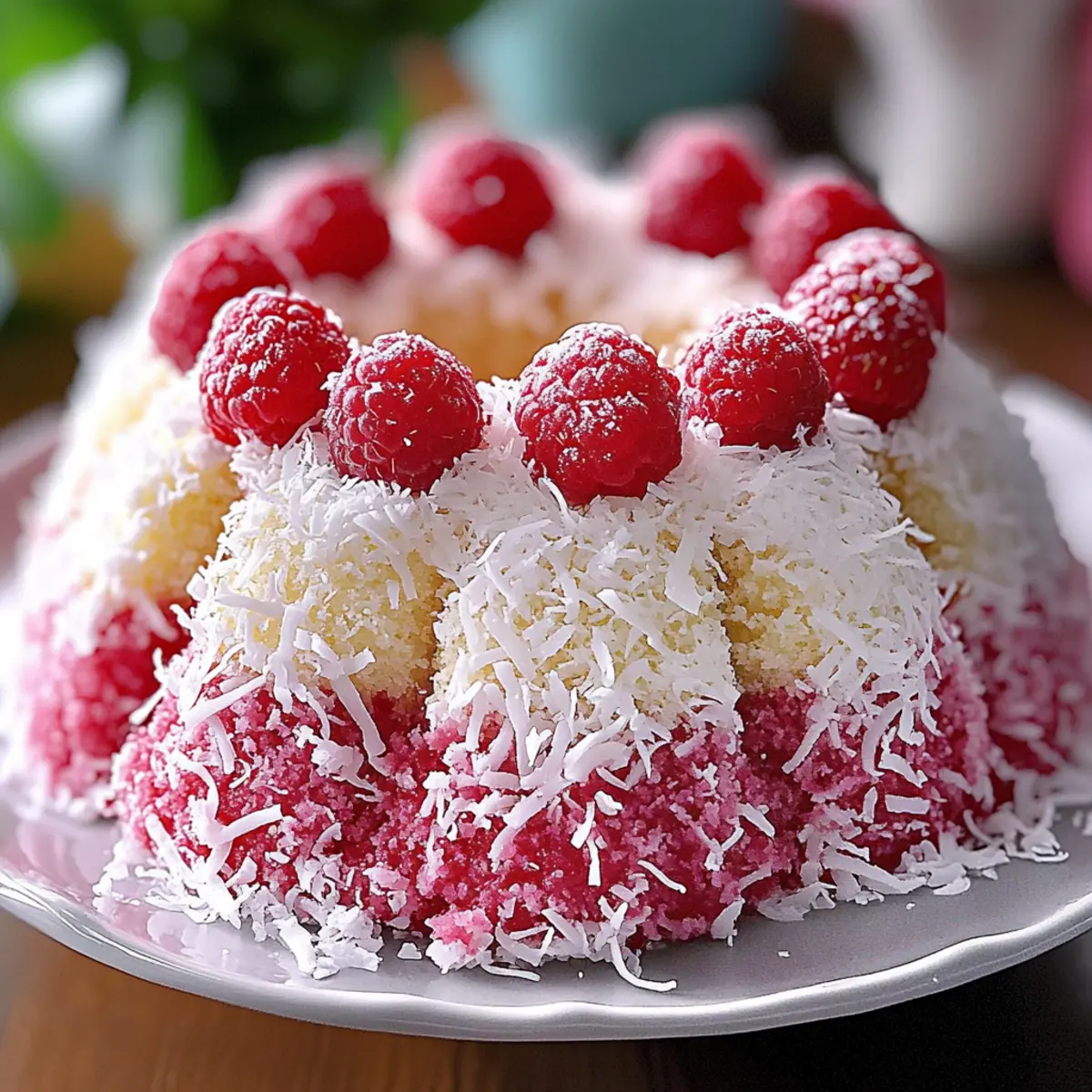 Start by greasing a dome-shaped cake pan with butter and dusting it lightly with flour to prevent sticking. Preheat your oven to 350°F (175°C), ensuring it’s ready for a perfect bake. This initial step sets the foundation for your Raspberry Coconut Snowball Cake, allowing it to rise beautifully.