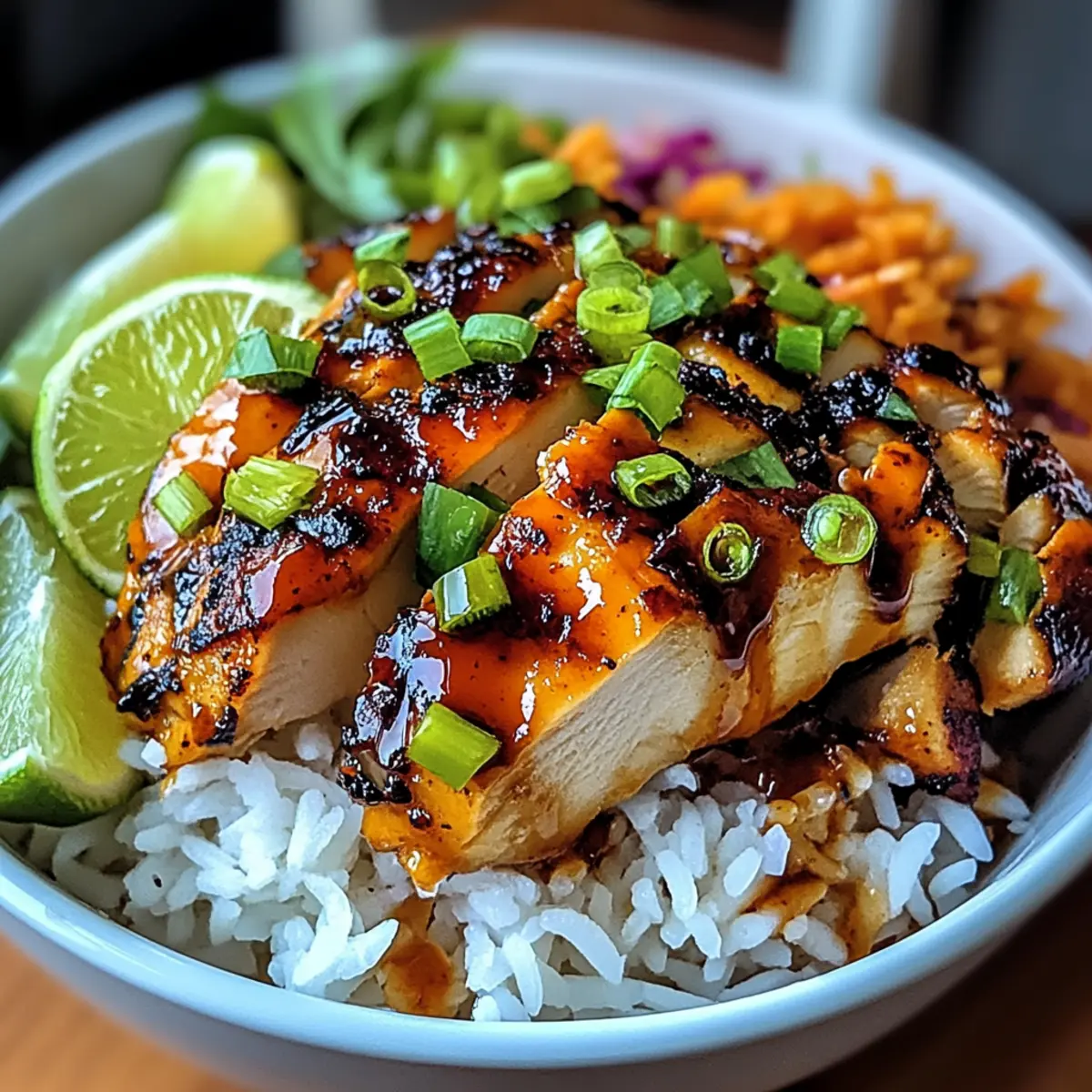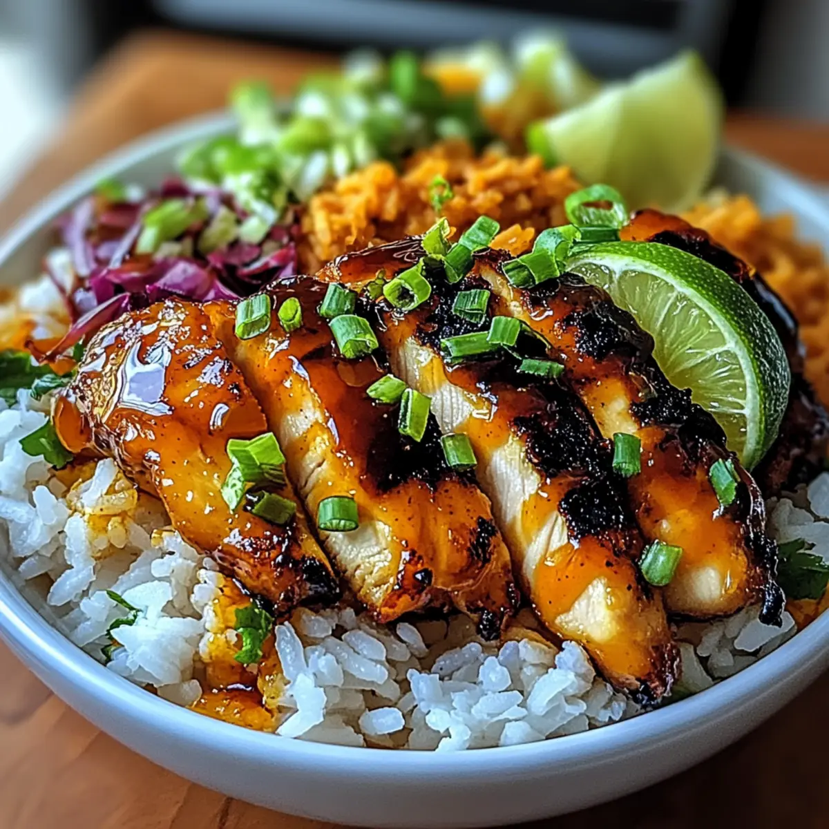 - To serve, spoon the coconut rice onto plates, place the glazed chicken on top, drizzle remaining sauce over chicken, and finish with garnished green onions and lime wedges.