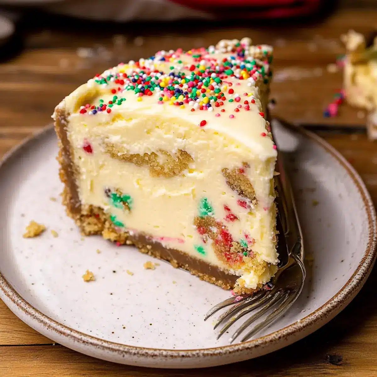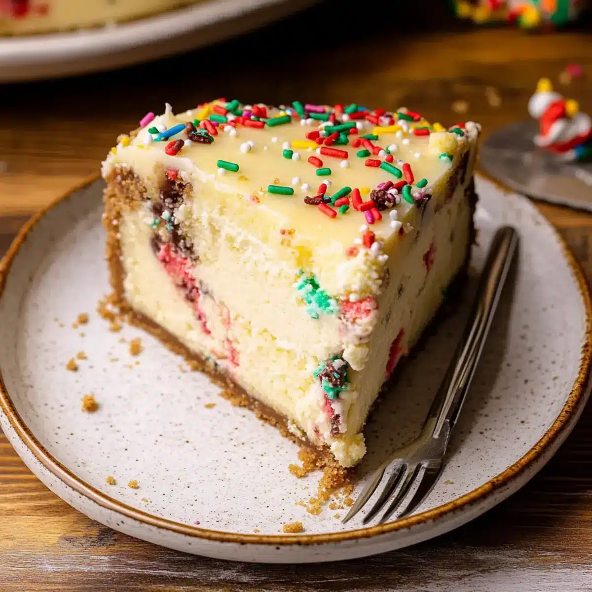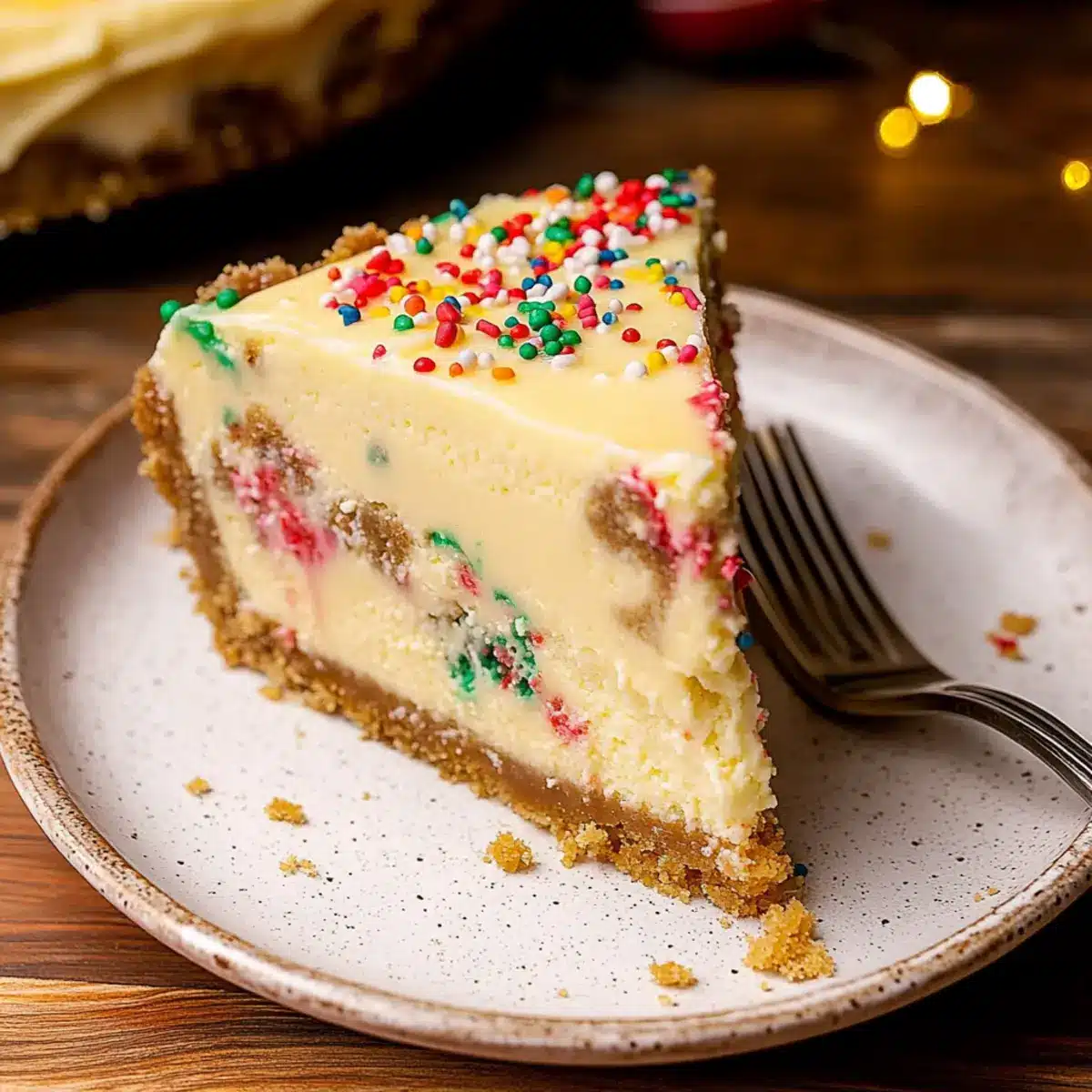Festive Appeal: Dressed with colorful Christmas sprinkles, this cheesecake is like a celebration on a plate, perfect for any holiday gathering.