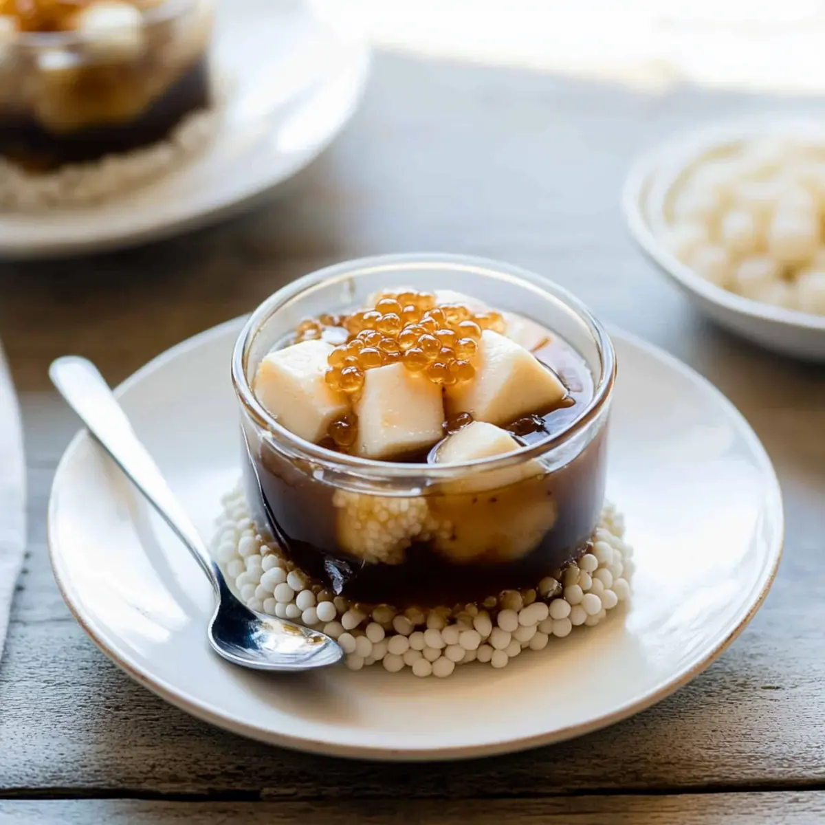 - Layer the set tofu with arnibal syrup and cooked sago pearls to serve.
